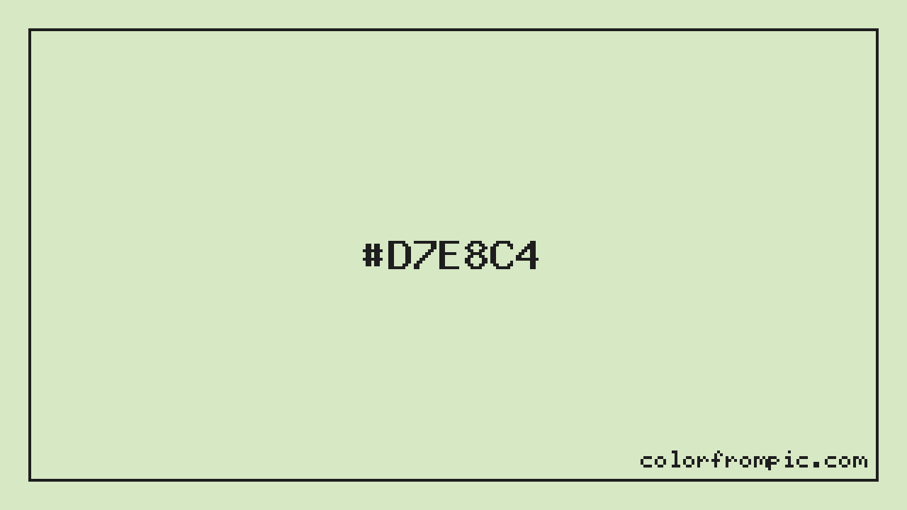 The HEX code for Light Chartreuse is #D7E8C4. In CSS you can use it directly as color: #D7E8C4; or as a background: background-color: #D7E8C4;. The three-character shorthand is not available for this color since it cannot be reduced without changing the value. Use the full six-character hex for accurate reproduction in any web or design project.