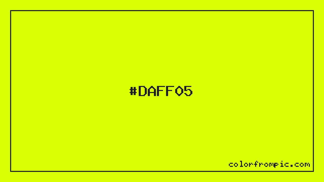 The RGB value of #DAFF05 is rgb(218, 255, 5). This means the color contains 218 out of 255 parts red, 255 out of 255 parts green, and 5 out of 255 parts blue. Red is the weakest (with blue dominant) channel in this color mix. You can use the full RGB function in any CSS property: color: rgb(218, 255, 5);