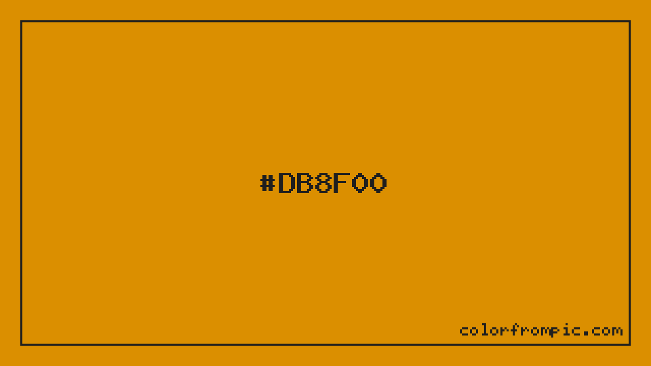 The HEX code for Vivid Orange is #DB8F00. In CSS you can use it directly as color: #DB8F00; or as a background: background-color: #DB8F00;. The three-character shorthand is not available for this color since it cannot be reduced without changing the value. Use the full six-character hex for accurate reproduction in any web or design project.