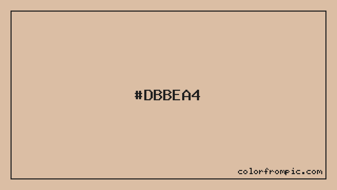 The approximate CMYK value of #DBBEA4 is C:0% M:13% Y:25% K:14%. CMYK (Cyan, Magenta, Yellow, Key/Black) is the color model used in physical printing. Unlike RGB which mixes light additively on screens, CMYK mixes inks subtractively on paper. Note that the RGB-to-CMYK conversion is an approximation — screen colors and print colors exist in different color gamuts, and some screen colors cannot be exactly reproduced in print. For precise print work, consult a professional print color profile or Pantone matching system.