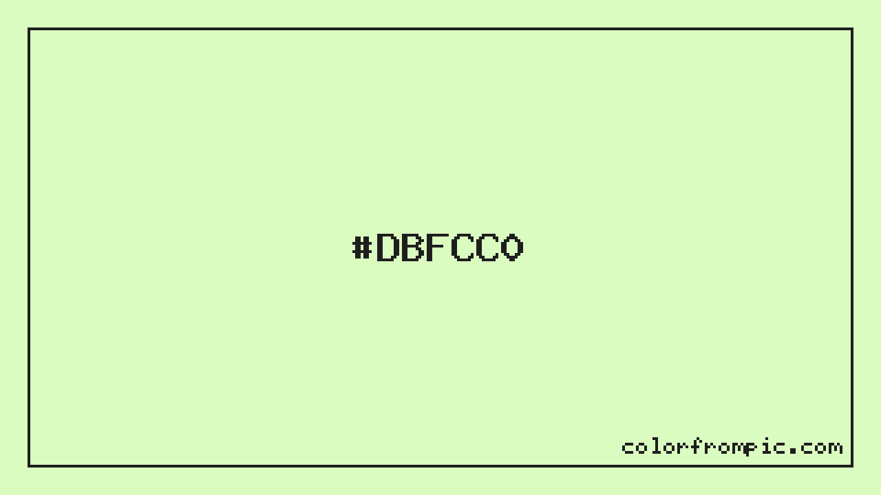 The HEX code for Light Vivid Green is #DBFCC0. In CSS you can use it directly as color: #DBFCC0; or as a background: background-color: #DBFCC0;. The three-character shorthand is not available for this color since it cannot be reduced without changing the value. Use the full six-character hex for accurate reproduction in any web or design project.
