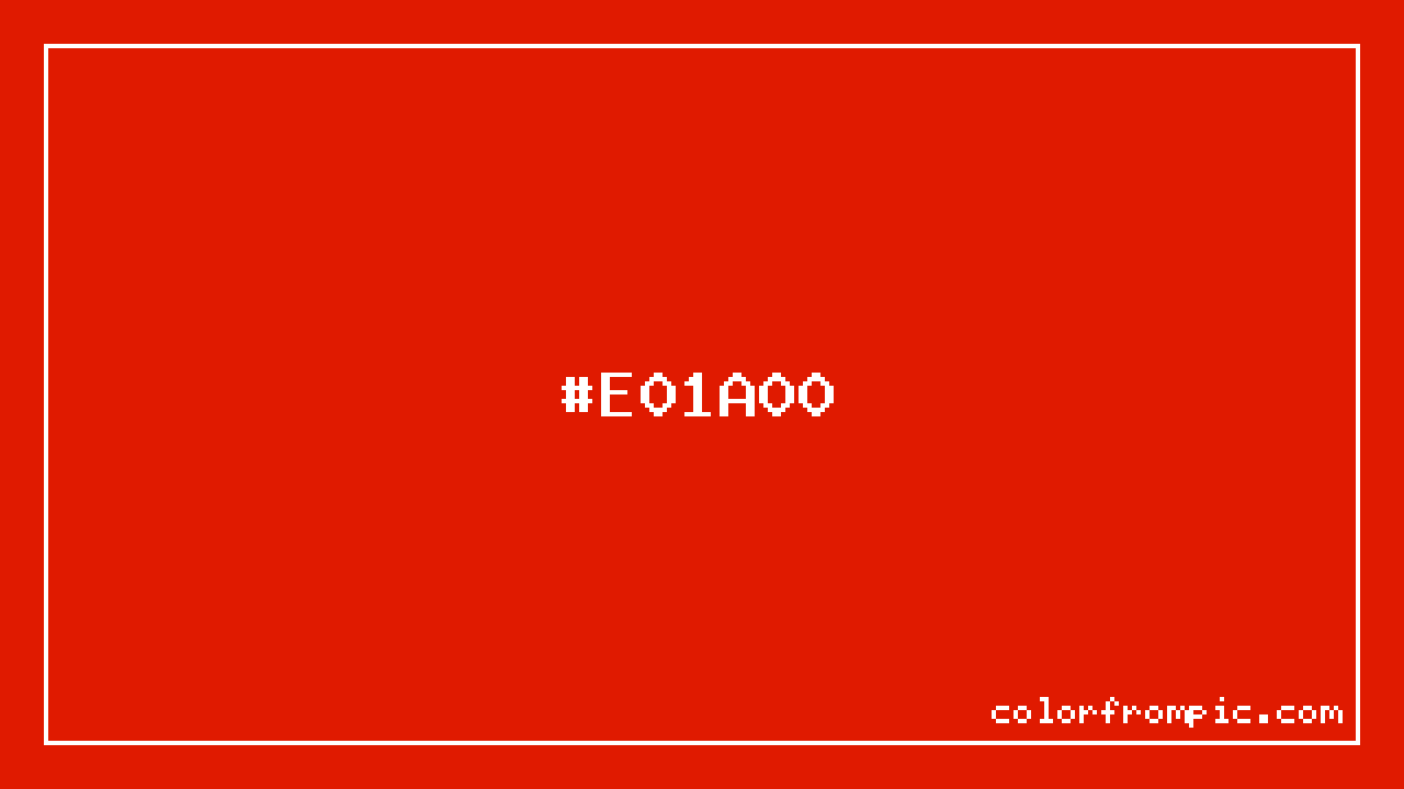 The hexadecimal color code #E01A00 represents a medium shade in the red family. In the RGB color model, this color is composed of 224 red, 26 green, and 0 blue, which translates to approximately 88% red, 10% green, and 0% blue. This makes it a highly saturated color with warm undertones that can evoke different emotional responses depending on its application.