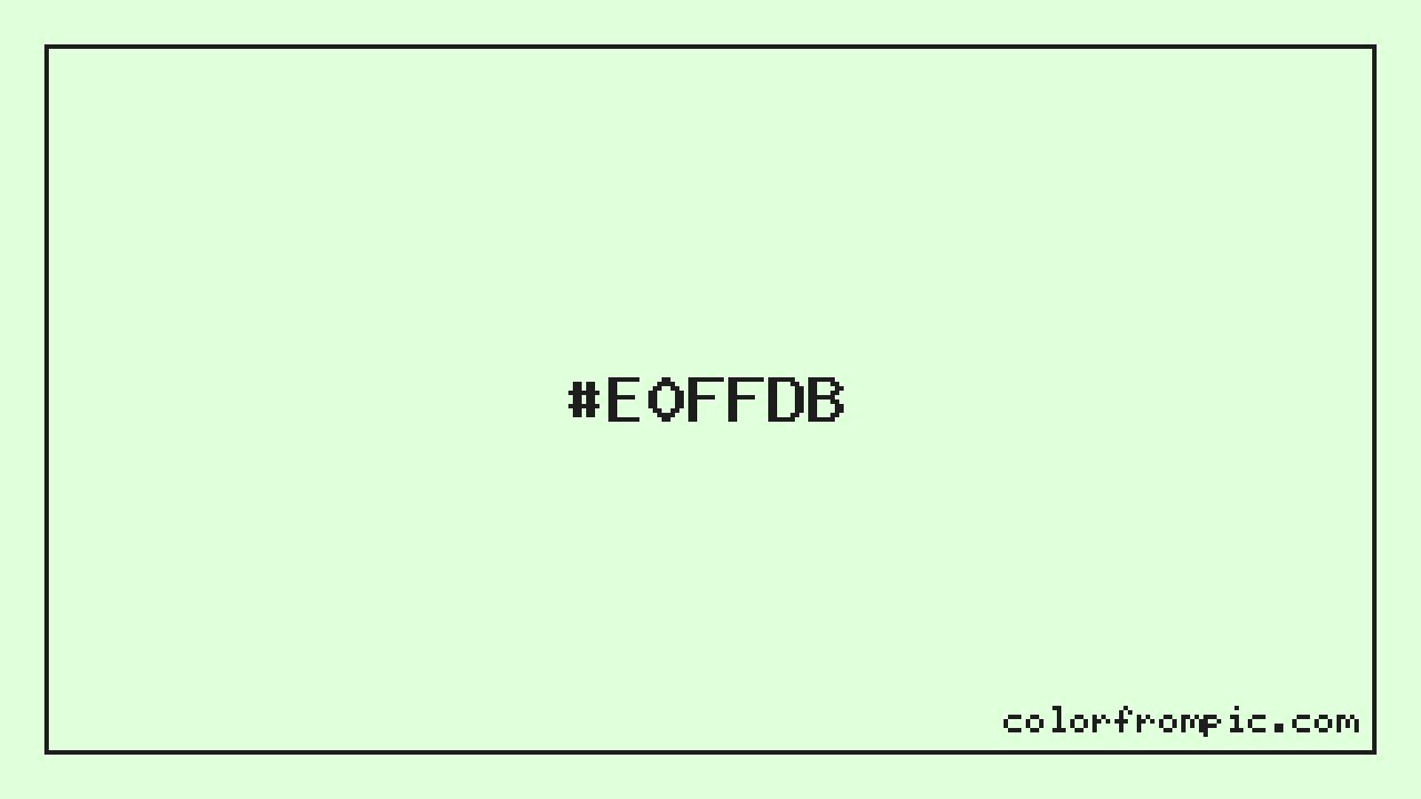 The HEX code for Very Light Vivid Green is #E0FFDB. In CSS you can use it directly as color: #E0FFDB; or as a background: background-color: #E0FFDB;. The three-character shorthand is not available for this color since it cannot be reduced without changing the value. Use the full six-character hex for accurate reproduction in any web or design project.