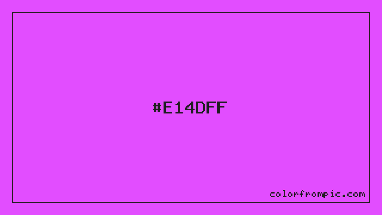 The HEX code for Soft Vivid Purple is #E14DFF. In CSS you can use it directly as color: #E14DFF; or as a background: background-color: #E14DFF;. The three-character shorthand is not available for this color since it cannot be reduced without changing the value. Use the full six-character hex for accurate reproduction in any web or design project.