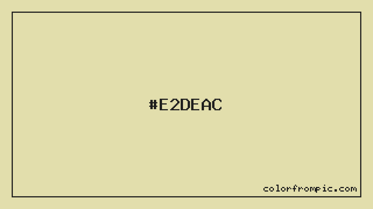 This color works well in various design contexts. As a lighter shade, it's excellent for backgrounds, negative space, and creating a sense of openness in designs. The moderate to low saturation gives this color a sophisticated, muted quality that works well in professional and minimalist designs. When pairing #E2DEAC with other colors, consider its complementary color at hue 236° for maximum contrast, or use analogous colors within 30° of its hue for harmonious combinations. The decimal representation of this color is 14868140, which can be useful in certain programming contexts.
