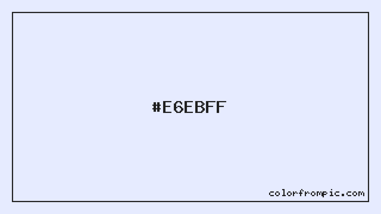 The HEX code for Very Light Vivid Blue is #E6EBFF. In CSS you can use it directly as color: #E6EBFF; or as a background: background-color: #E6EBFF;. The three-character shorthand is not available for this color since it cannot be reduced without changing the value. Use the full six-character hex for accurate reproduction in any web or design project.