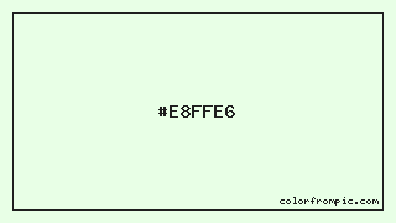 The HEX code for Very Light Vivid Green is #E8FFE6. In CSS you can use it directly as color: #E8FFE6; or as a background: background-color: #E8FFE6;. The three-character shorthand is not available for this color since it cannot be reduced without changing the value. Use the full six-character hex for accurate reproduction in any web or design project.