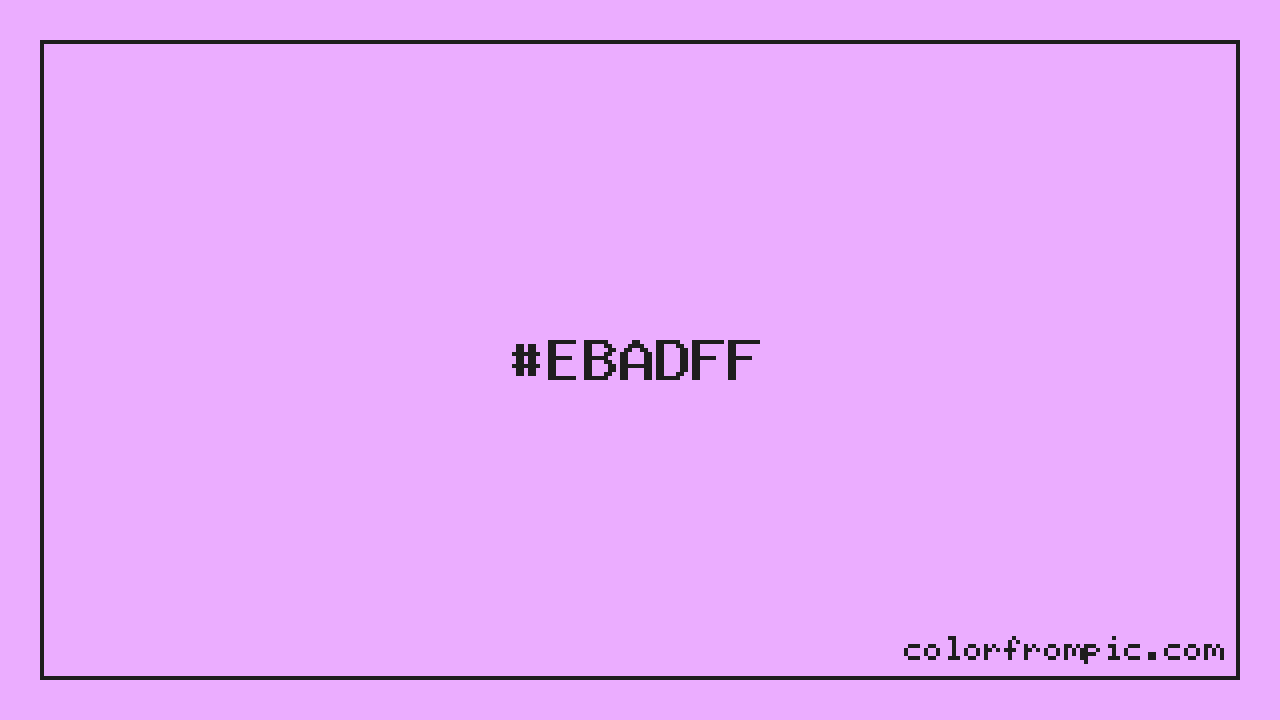 The HEX code for Light Vivid Purple is #EBADFF. In CSS you can use it directly as color: #EBADFF; or as a background: background-color: #EBADFF;. The three-character shorthand is not available for this color since it cannot be reduced without changing the value. Use the full six-character hex for accurate reproduction in any web or design project.