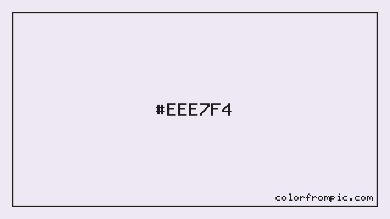 The HEX code for Very Light Violet is #EEE7F4. In CSS you can use it directly as color: #EEE7F4; or as a background: background-color: #EEE7F4;. The three-character shorthand is not available for this color since it cannot be reduced without changing the value. Use the full six-character hex for accurate reproduction in any web or design project.