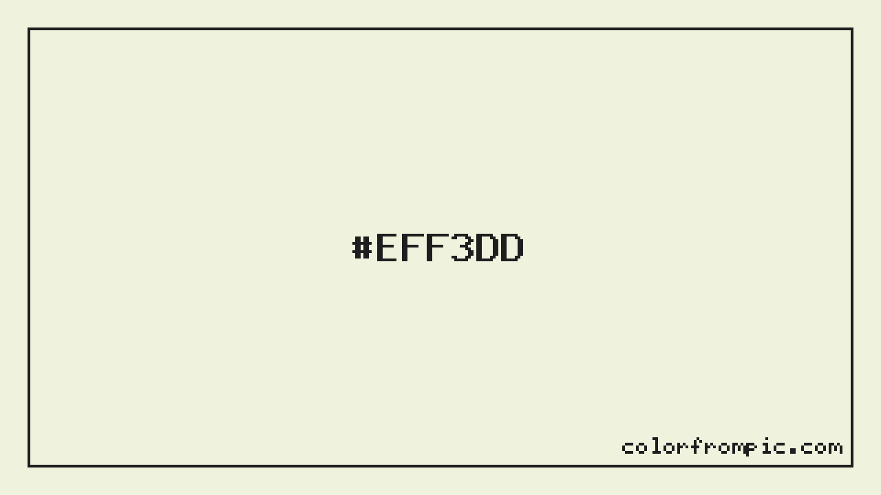 For print applications using the CMYK color model, #EFF3DD would be reproduced using 2% cyan, 0% magenta, 9% yellow, and 5% black. The closest web-safe color is #FFFFCC, which may be useful for ensuring compatibility across older displays and systems.