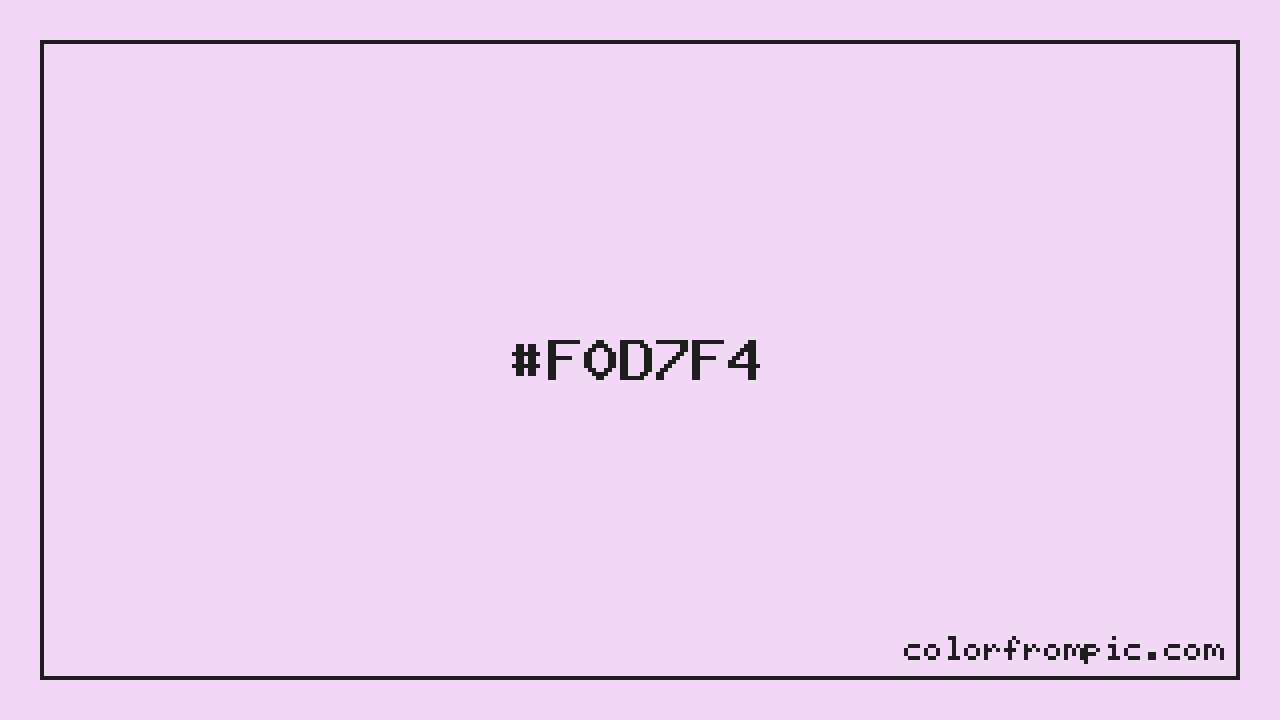 The approximate CMYK value of #F0D7F4 is C:2% M:12% Y:0% K:4%. CMYK (Cyan, Magenta, Yellow, Key/Black) is the color model used in physical printing. Unlike RGB which mixes light additively on screens, CMYK mixes inks subtractively on paper. Note that the RGB-to-CMYK conversion is an approximation — screen colors and print colors exist in different color gamuts, and some screen colors cannot be exactly reproduced in print. For precise print work, consult a professional print color profile or Pantone matching system.
