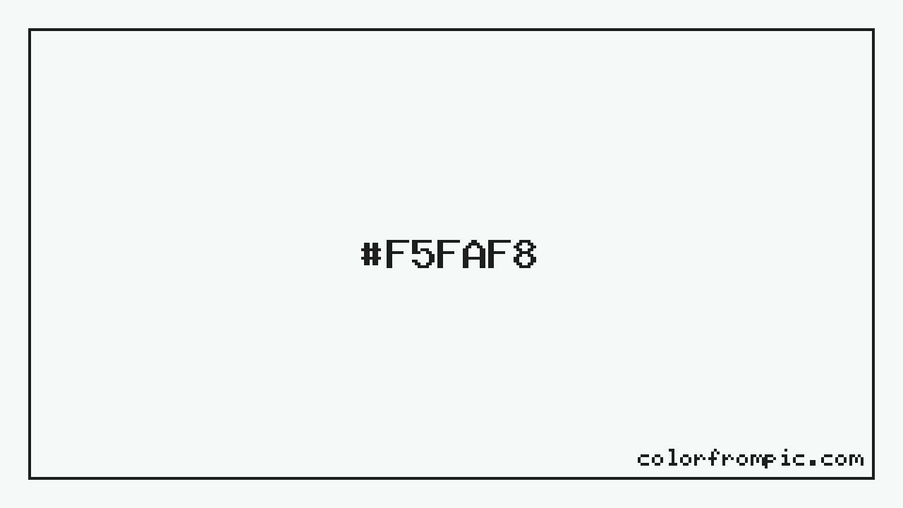 The HEX code for Very Light Teal is #F5FAF8. In CSS you can use it directly as color: #F5FAF8; or as a background: background-color: #F5FAF8;. The three-character shorthand is not available for this color since it cannot be reduced without changing the value. Use the full six-character hex for accurate reproduction in any web or design project.