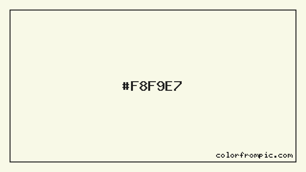 The HEX code for Very Light Warm Yellow is #F8F9E7. In CSS you can use it directly as color: #F8F9E7; or as a background: background-color: #F8F9E7;. The three-character shorthand is not available for this color since it cannot be reduced without changing the value. Use the full six-character hex for accurate reproduction in any web or design project.