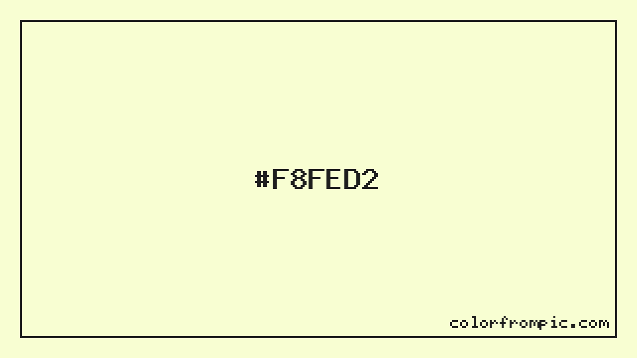 The hexadecimal color code #F8FED2 represents a very light shade in the yellow family. In the RGB color model, this color is composed of 248 red, 254 green, and 210 blue, which translates to approximately 97% red, 100% green, and 82% blue. This makes it a highly saturated color with cool undertones that can evoke different emotional responses depending on its application.