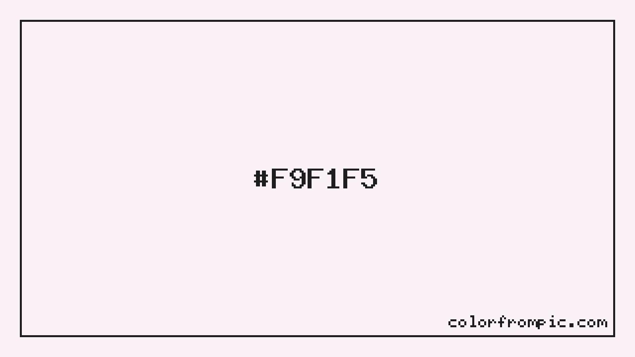 The HEX code for Very Light Magenta is #F9F1F5. In CSS you can use it directly as color: #F9F1F5; or as a background: background-color: #F9F1F5;. The three-character shorthand is not available for this color since it cannot be reduced without changing the value. Use the full six-character hex for accurate reproduction in any web or design project.