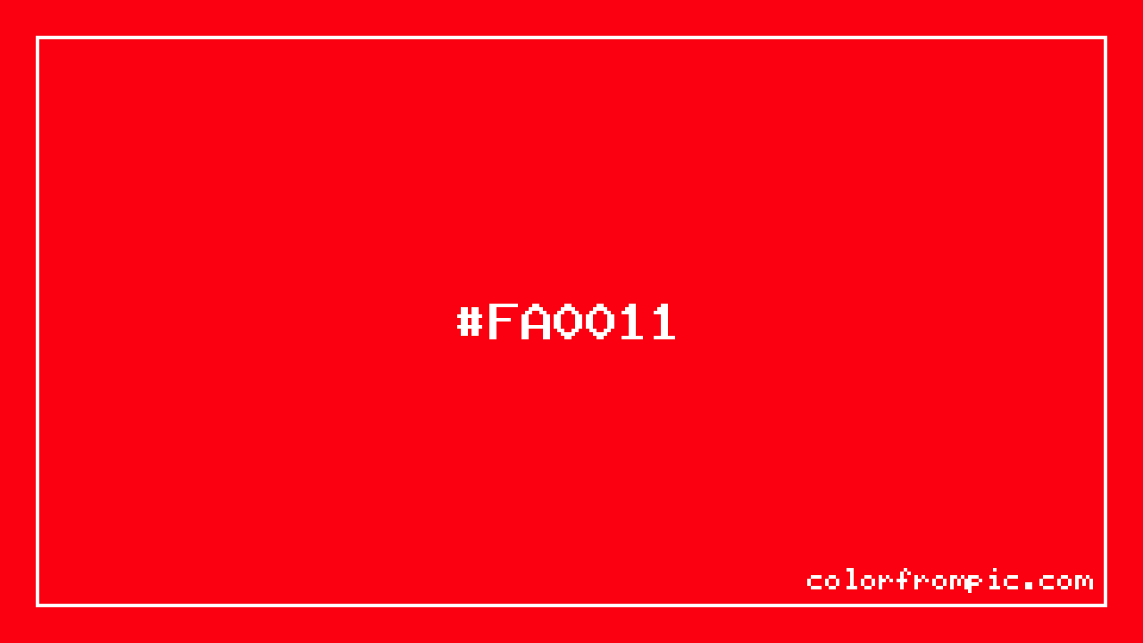 The hexadecimal color code #FA0011 represents a medium shade in the red family. In the RGB color model, this color is composed of 250 red, 0 green, and 17 blue, which translates to approximately 98% red, 0% green, and 7% blue. This makes it a highly saturated color with warm undertones that can evoke different emotional responses depending on its application.