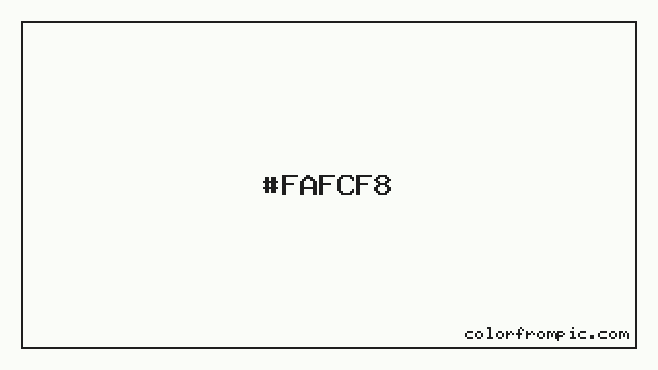 The hexadecimal color code #FAFCF8 represents a very light shade in the green family. In the RGB color model, this color is composed of 250 red, 252 green, and 248 blue, which translates to approximately 98% red, 99% green, and 97% blue. This makes it a slightly desaturated color with cool undertones that can evoke different emotional responses depending on its application.