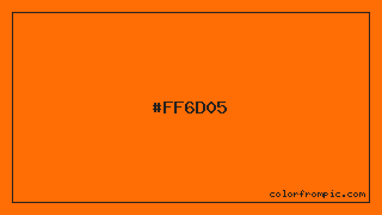 The HEX code for Vivid Vermilion is #FF6D05. In CSS you can use it directly as color: #FF6D05; or as a background: background-color: #FF6D05;. The three-character shorthand is not available for this color since it cannot be reduced without changing the value. Use the full six-character hex for accurate reproduction in any web or design project.
