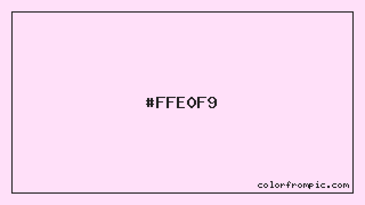 The HEX code for Very Light Vivid Magenta is #FFE0F9. In CSS you can use it directly as color: #FFE0F9; or as a background: background-color: #FFE0F9;. The three-character shorthand is not available for this color since it cannot be reduced without changing the value. Use the full six-character hex for accurate reproduction in any web or design project.